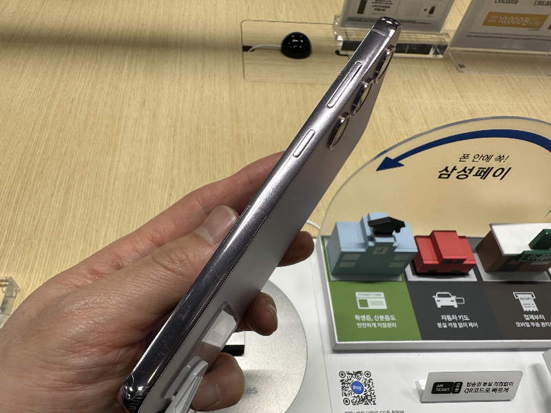 라벤더 색상의 옆면과 위아래 모두 라벤더 색으로 맞췄다. 라베더 색이 아무래도 여성에게 더 어울릴 것 같지만 필자도 아이폰14프로 딥퍼플 색을 갖고 있으니 성별로 선호도를 정하기는 쉽지 않다. 아이폰 딥퍼플은 어두컴컴한 느낌이 있지만 갤럭시 라벤더는 화사한 색이기 때문에 아무래도 여성느낌이 좀 강하기는 하다.