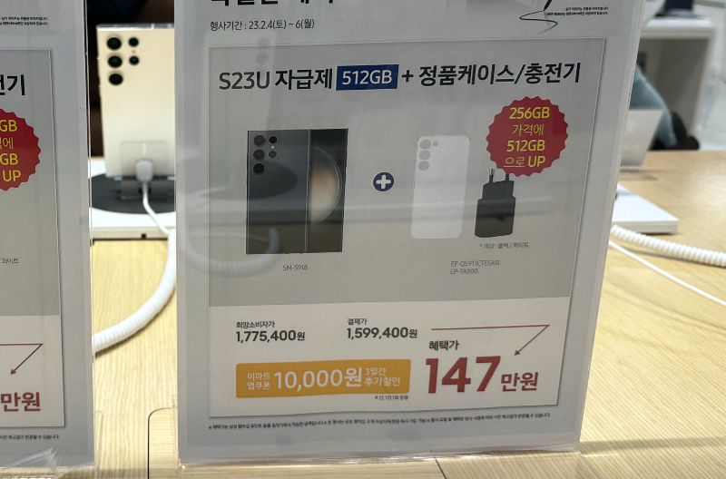 S23이 프리미엄 이미지가 많이 퇴색했기는 했지만 요즘 시대에 100만원 정도에 구입하면 나름대로 매리트가 느껴진다. 게다가 256기가를 사면 512GB로 업그레이드해 주고 정품케이스와 충전기를 주니 놓치기 싫은 쏠쏠한 혜택이다.